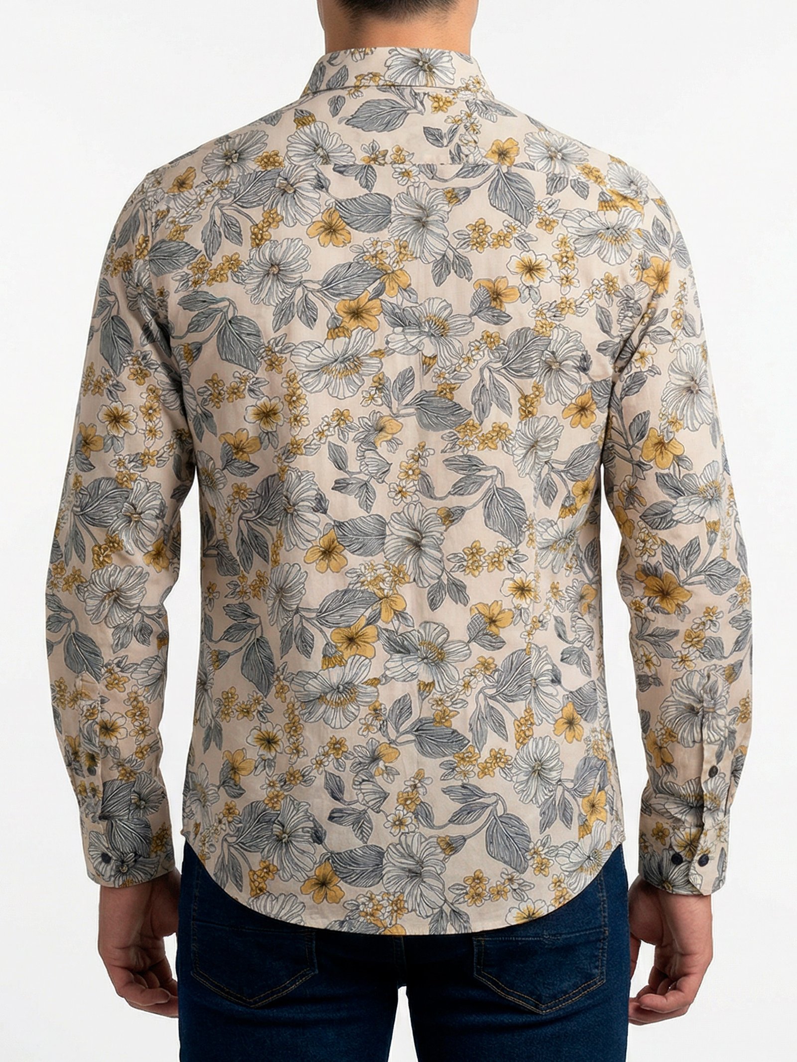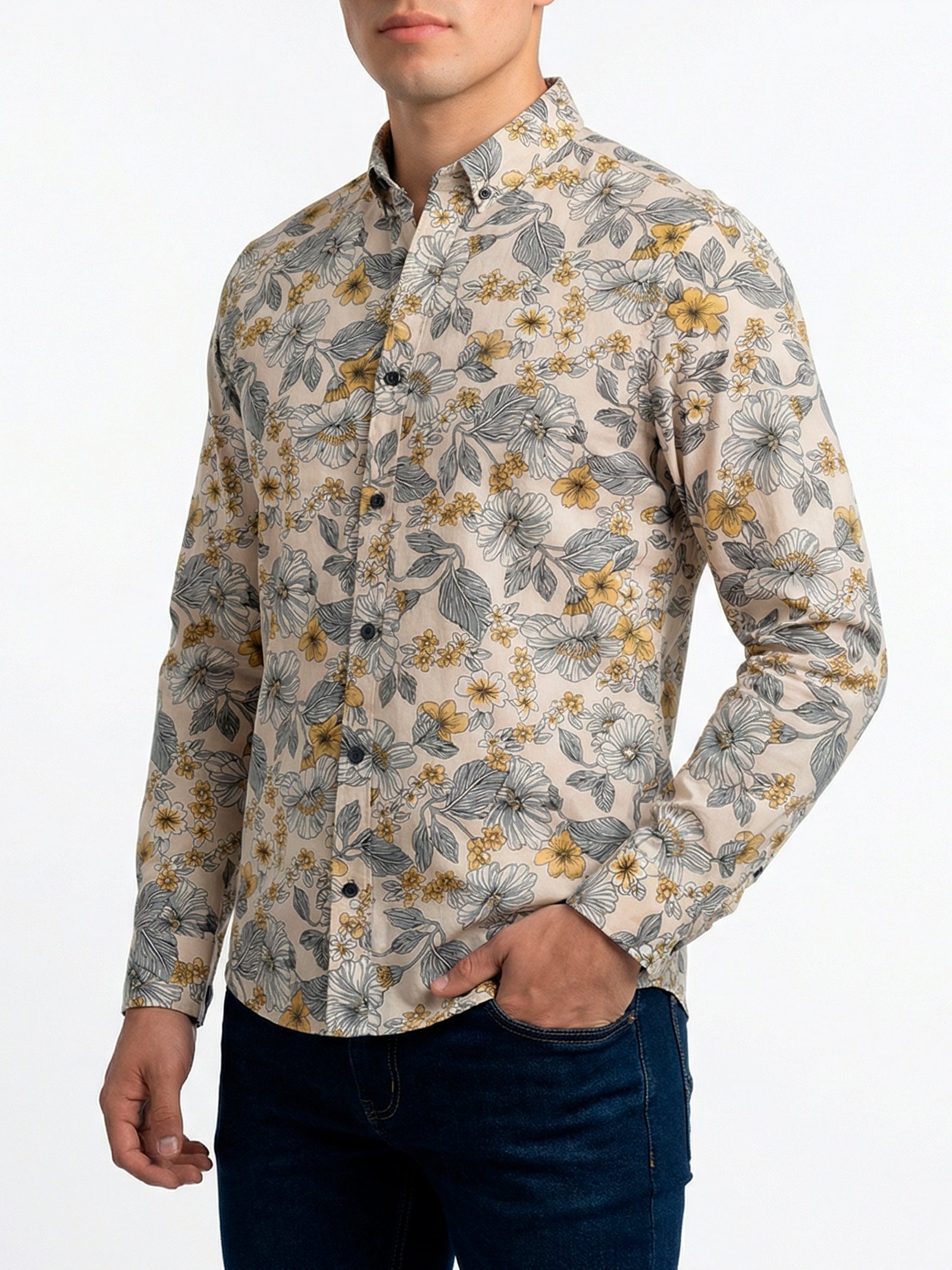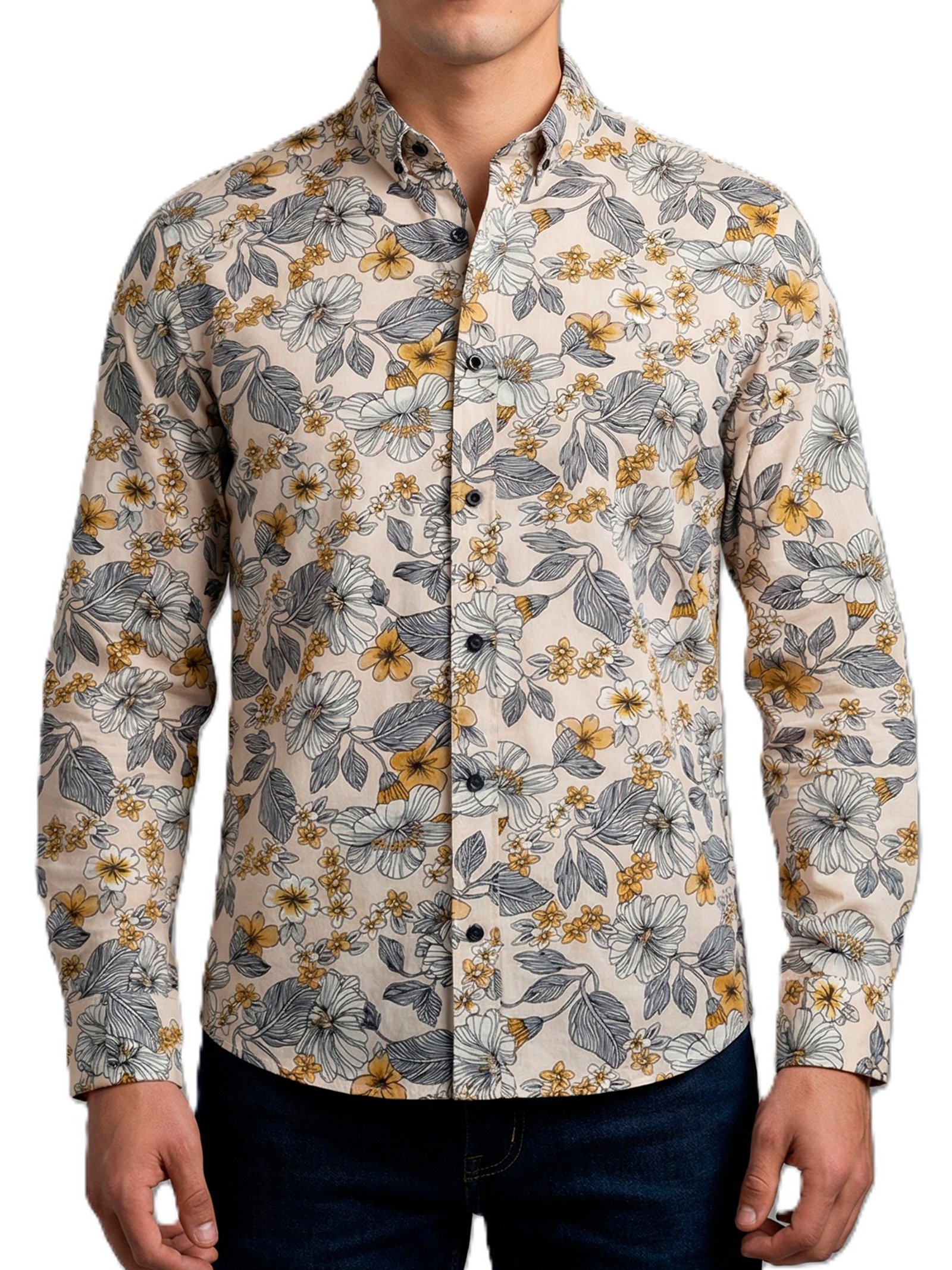 Camisa para Caballero Casual Slim Fit Beige Mini Flores Amarillas, Blancas.