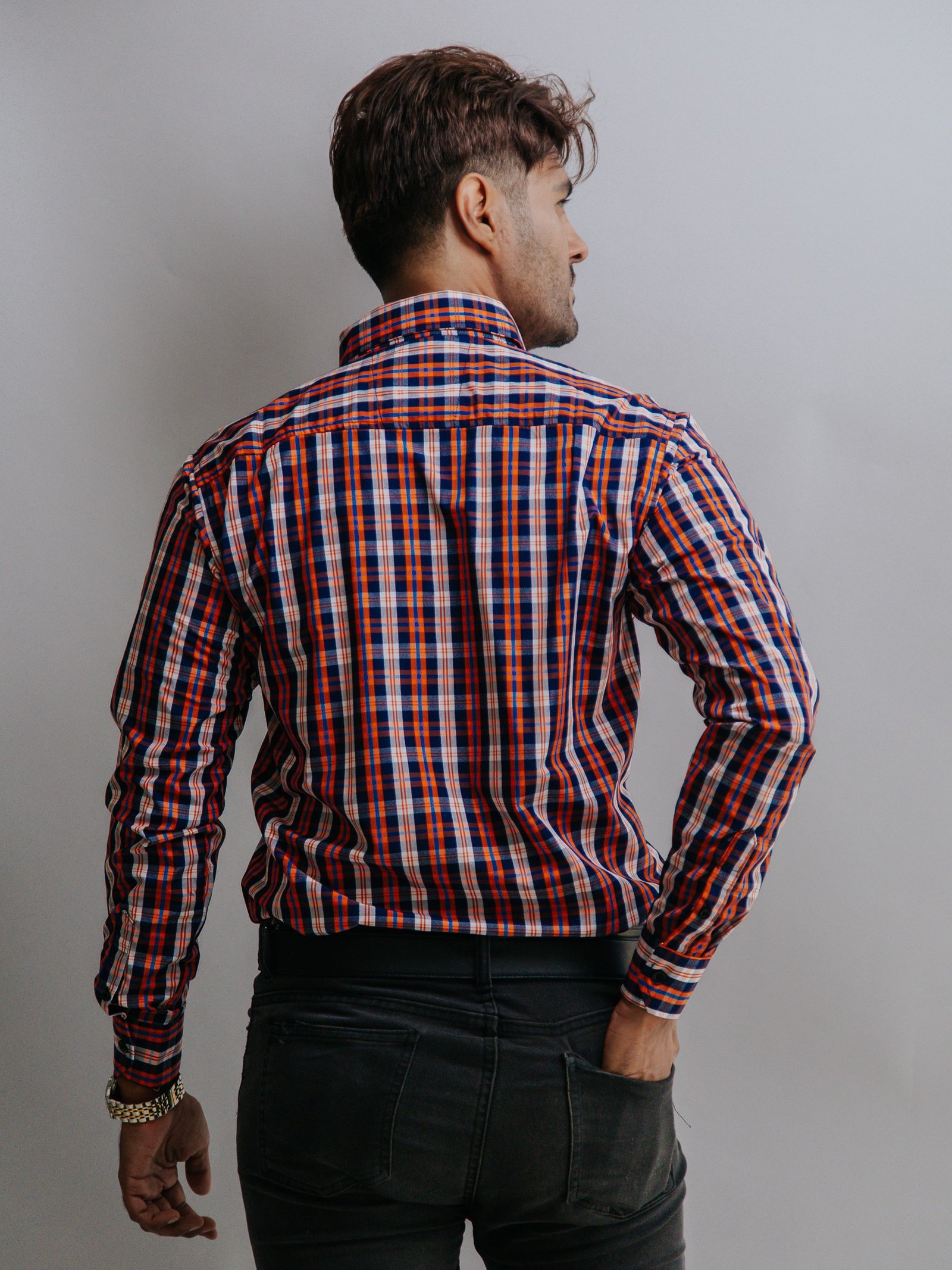Camisa para Caballero Casual Slim Fit Cuadros Naranja, Azul Marino, Blancos.