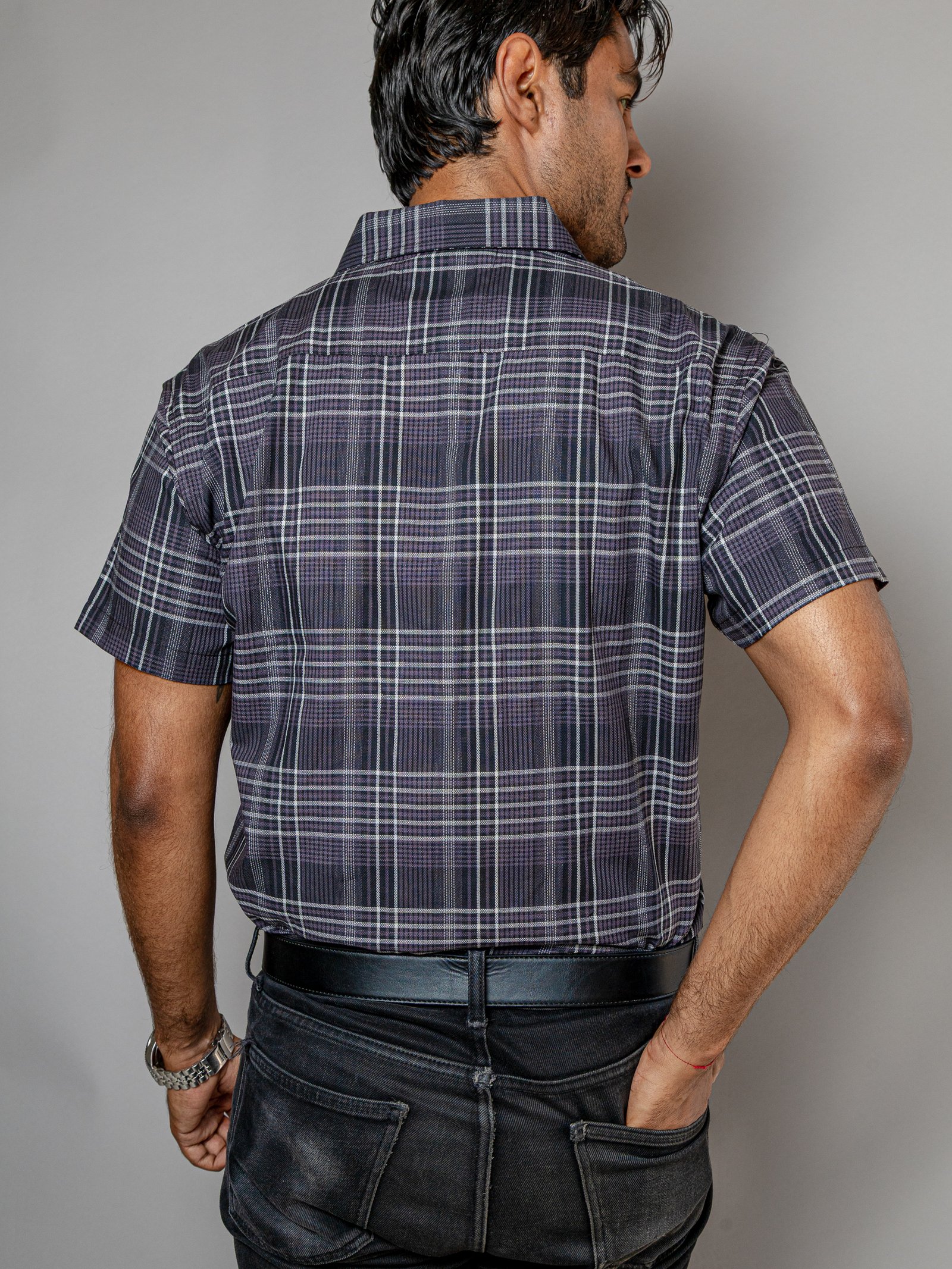 Camisa para Caballero Casual Slim Fit Cuadros Negros, Griss Oscuro Lineas Blancas.