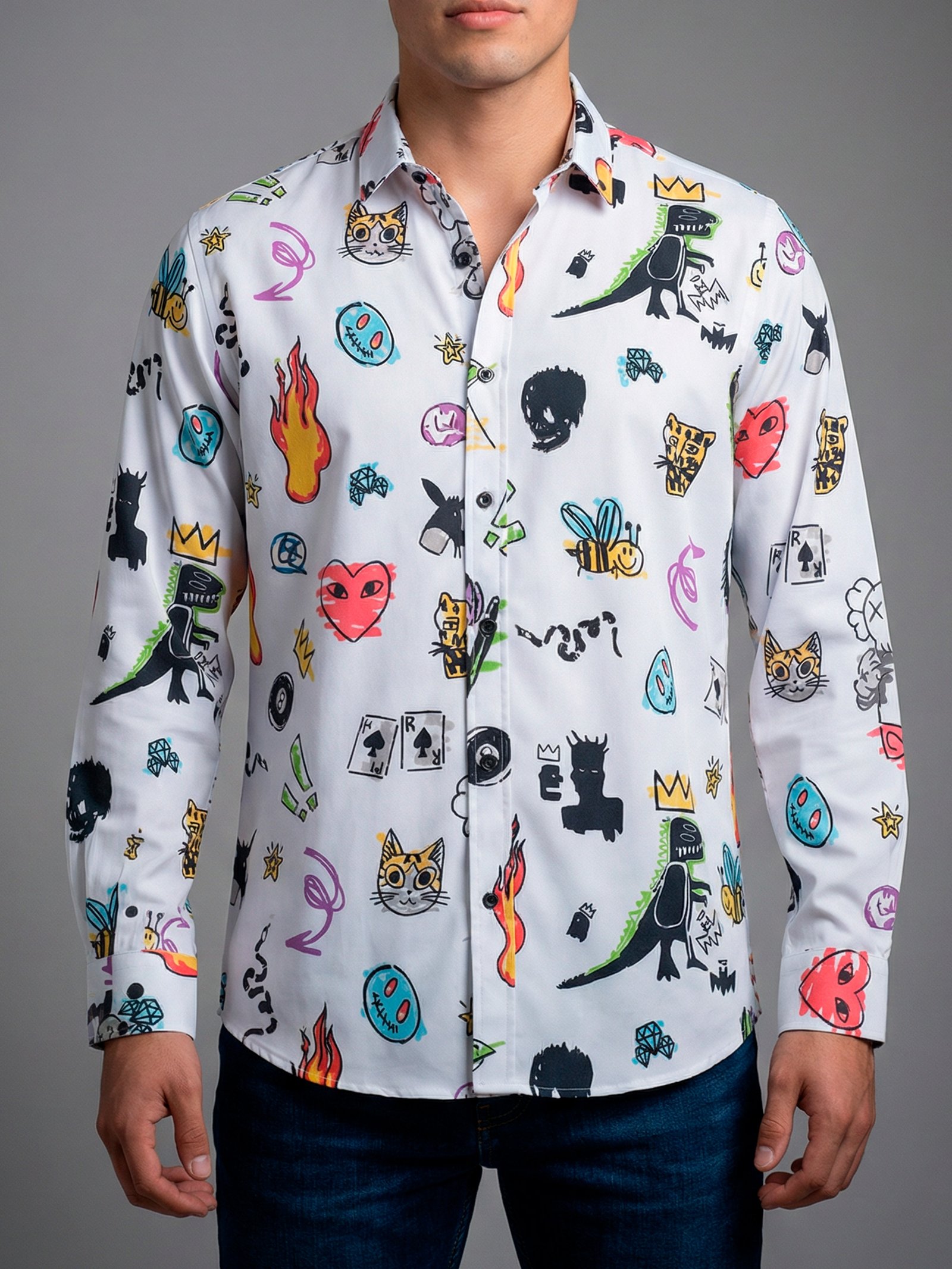 Camisa Hombre Casual Blanco Figuras Dibujos
