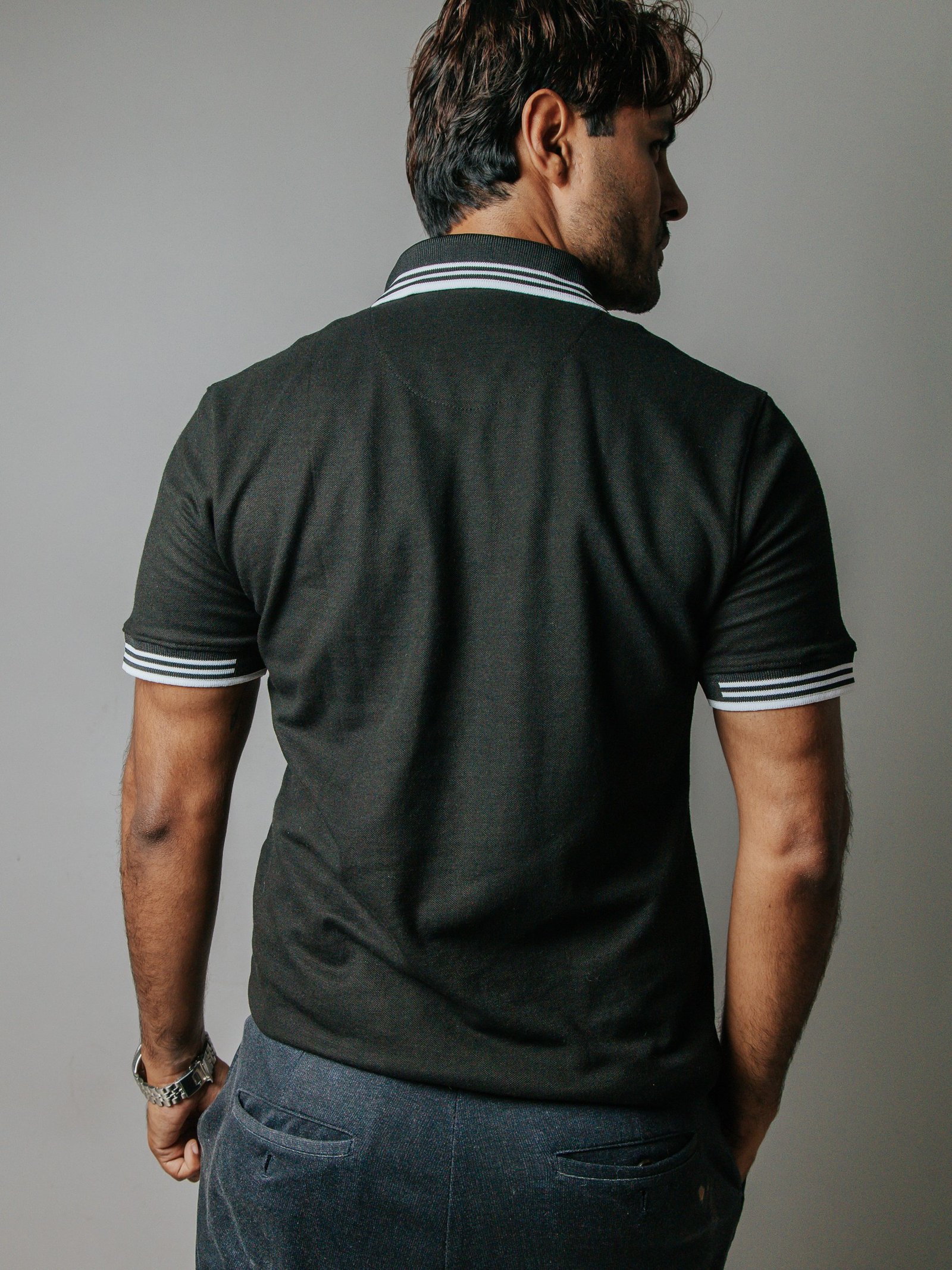 Playera tipo Polo para Caballero Casual Slim Fit Negra detalles Blancos.